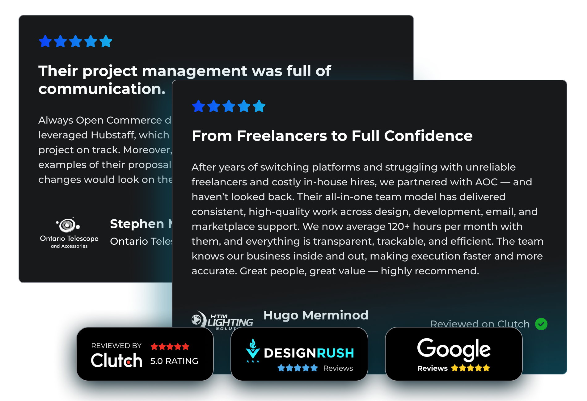 Our five-star reviews across Google, Clutch, BigCommerce, Shopify, and DesignRush are for our work and how we work. Our strong collaboration makes our work more synchronized.