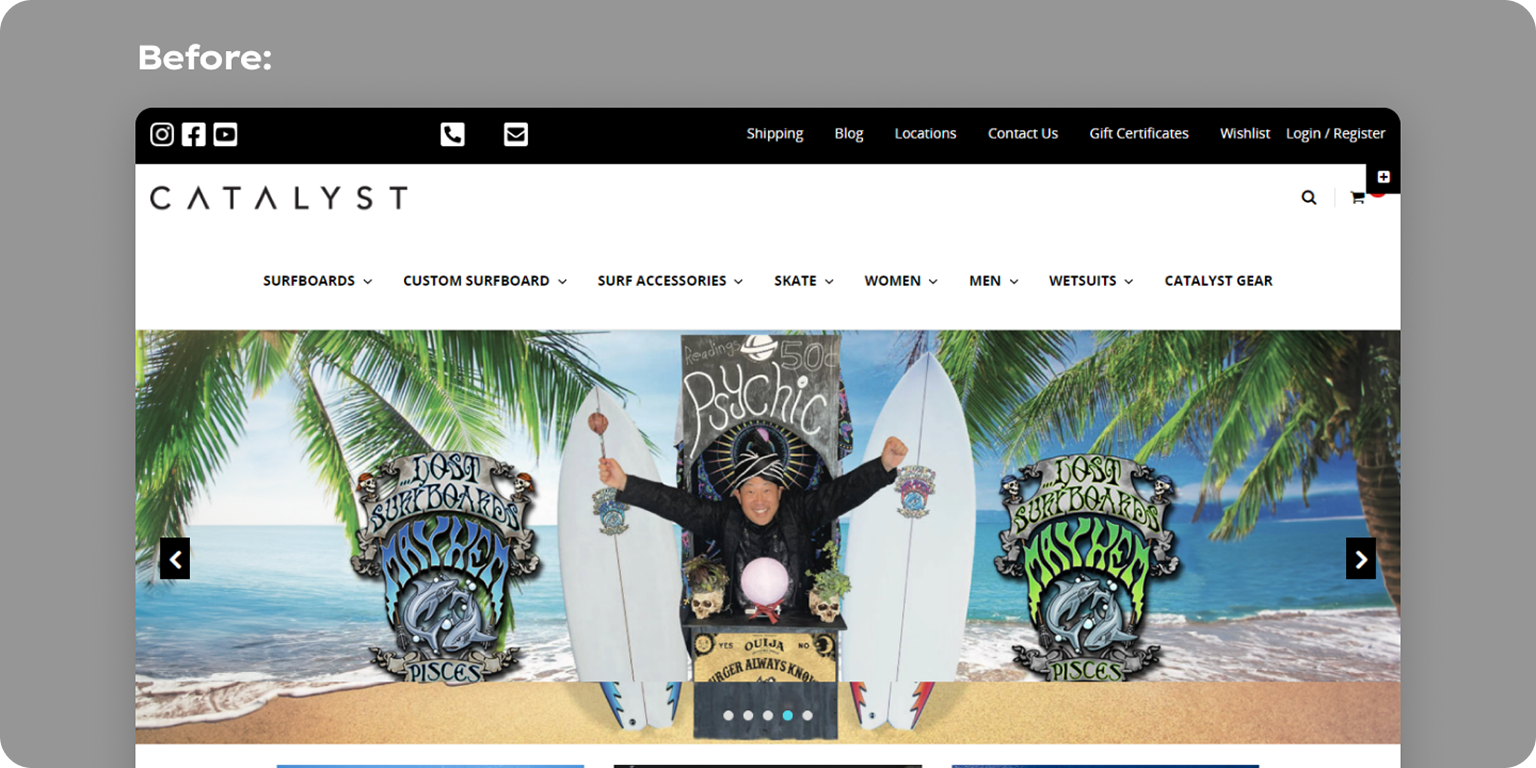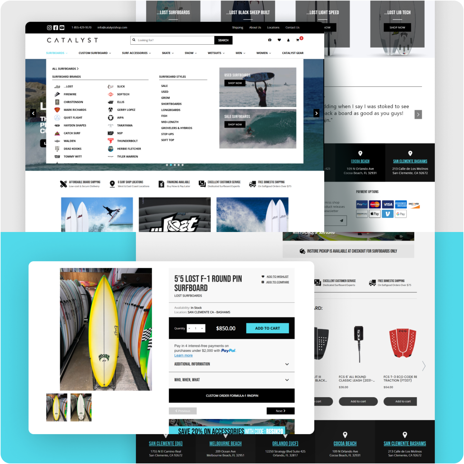 On top of this, Catalyst needed a platform strong enough to support a click-and-brick model. Surfboards, accessories, and apparel were stocked across multiple physical locations, each with its own inventory rules. Shipping was equally complex: oversized surfboards required dimensional logic, and customers in regions like Puerto Rico and Hawaii needed accurate regional shipping rates. Their new platform had to integrate deeply with ShipperHQ, preserve all SEO value from Magento, migrate thousands of products, and deliver a faster, cleaner, mobile-optimized shopping experience.