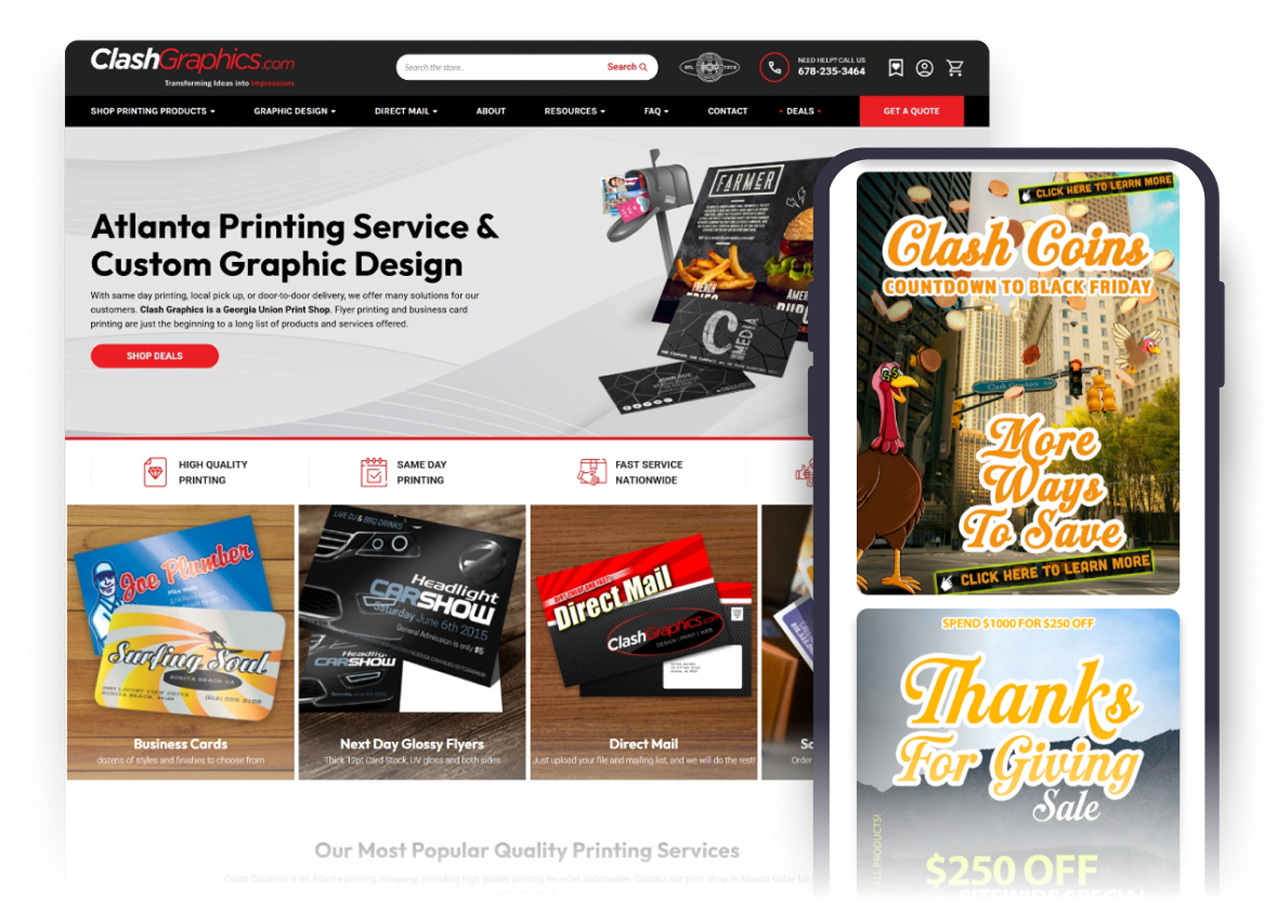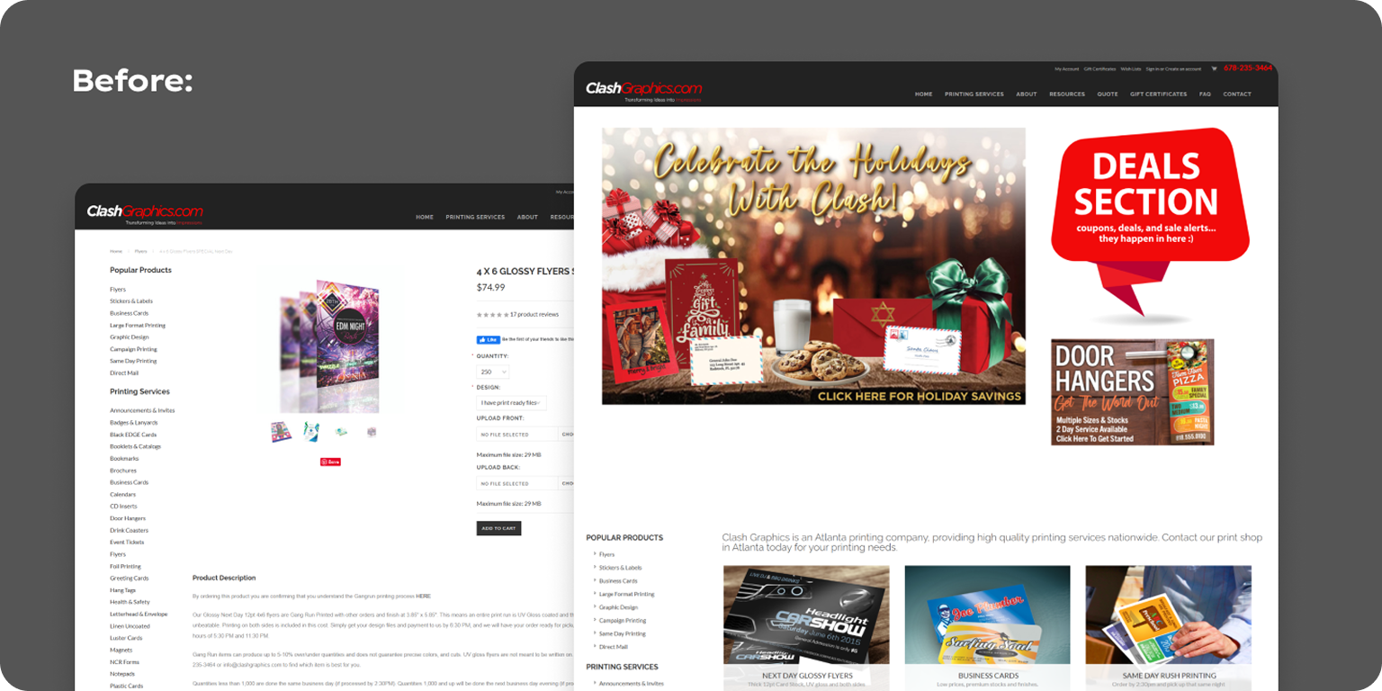 We began by upgrading Clash Graphics from their legacy Stencil framework to the newest Cornerstone theme, giving them a faster, more flexible foundation. From there, we rebuilt their homepage with a bold visual banner designed to immediately communicate brand strength, while reworking navigation and submenu behavior to reduce friction and help users find services quickly.