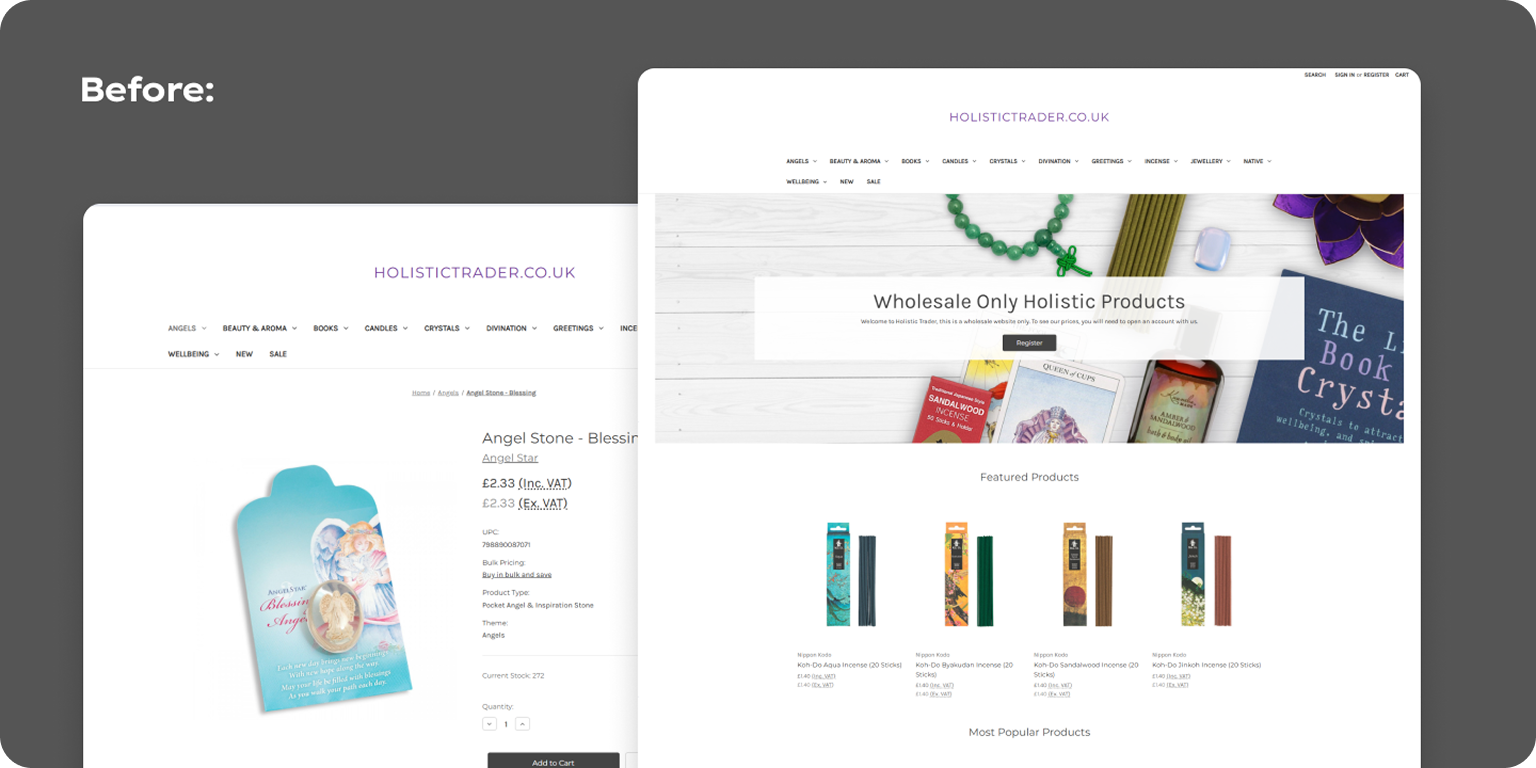 Before finding AOC, Holistic Trader worked with a UK based agency whose slow turnaround times, poor communication, and high retainer made even simple fixes frustrating. Meanwhile, functional issues were piling up—broken scrolling, faulty search results, incorrect tax logic, sale tags not appearing, inconsistent delivery information, failed filters, and GA4 data that was no longer accurate.