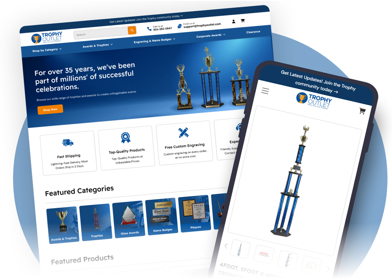 Trophy Outlet’s new BigCommerce store is cleaner, faster, and far more intuitive than their previous build, unlocking a meaningful improvement in how customers browse, customize, and purchase awards. The enhanced product configurator, restructured navigation, and streamlined checkout flow created a more modern and trustworthy shopping environment — exactly what the owner hoped to achieve after his first rebuild attempt fell short. Thanks to the Cornerstone migration and AOC’s UX/CRO-driven design, Trophy Outlet now has a scalable, future-proof foundation that makes purchasing easier and encourages repeat business.