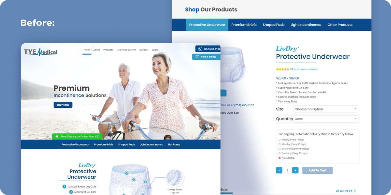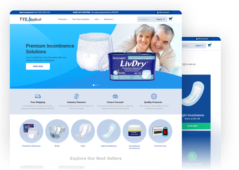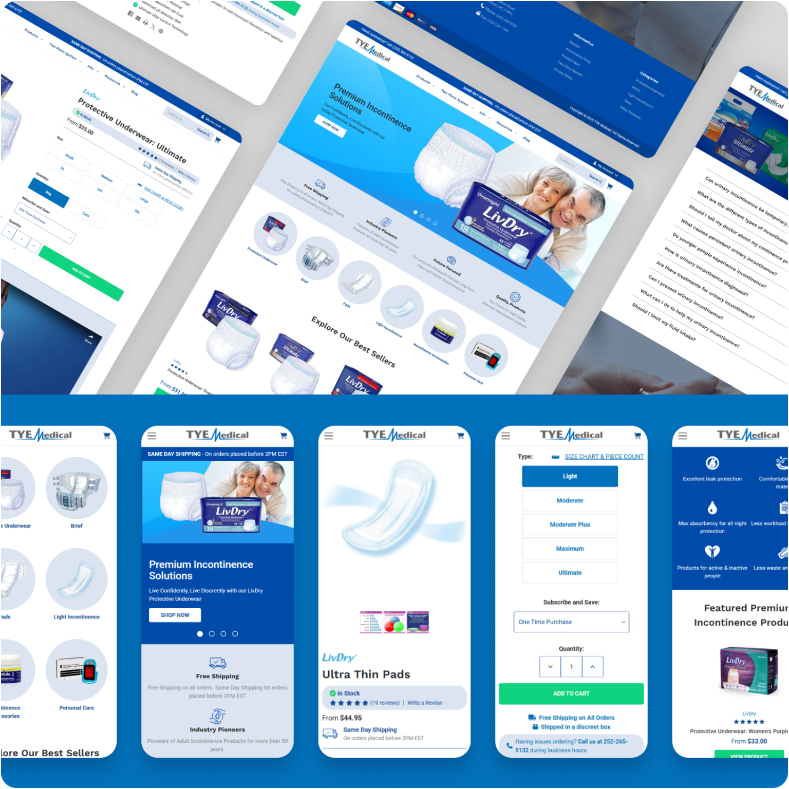 TYE Medical’s redesigned BigCommerce store now delivers a smoother, clearer, and more trustworthy shopping experience for customers navigating sensitive product needs. Strategic UX enhancements, stronger visual hierarchy, optimized flows, and modernized templates collectively improved conversion rates and organic performance.